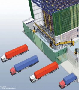 Una volta giunta dai reparti produttivi già stoccata negli appositi contenitori, la merce viene caricata nelle due baie di Ingresso: qui, viene presa in carico da uno dei 4 LGV attivi nell’area e convogliata fino a una delle quattro baie di ingresso del magazzino automatico.