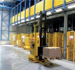 Oltre che alle operazioni di carico agli LGV è affidato anche il compito di prelevare i pallet e le UdC estratti dalle 4 baie di scarico dei trasloelevatori secondo le missioni pianificate dal WMS e veicolarli fino all’area di picking: qui, gli operatori possono effettuare il prelievo e preparare la merce per la spedizione agevolati da un’automazione ergonomica e studiata per garantire il giusto mix tra comfort e produttività, a partire dal sistema di regolazione dell’altezza del pallet, calibrata sul singolo pickerista al lavoro.