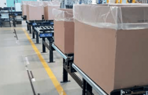 Le scatole vengono prima formate automaticamente e poi trasportate verso i punti di presa dei robot mobili tramite conveyor a rulli. Per permettere lo scambio scatole tra conveyor e robot mobili LD è stata installata a bordo di ogni robot una rulliera motorizzata.