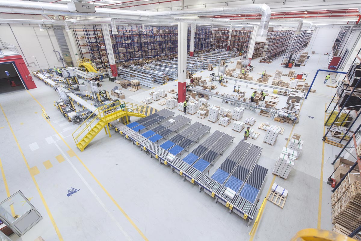 Tutte le tipologie di stoccaggio sono distribuite attorno ad un impianto automatico di movimentazione colli. Il picking avviene con modalità Pick & Pack dove il sistema di gestione WMS di LCS, sulla base del contenuto dell’ordine, calcola la quantità e la dimensione dei colli da spedire. Il binomio collo/ordine viene assegnato all’inizio della linea di movimentazione, ossia al momento dell’inserimento del collo vuoto sulla linea.